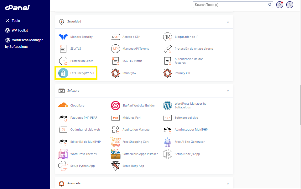 4. Dentro de Cpanel busca la opción "Seguridad" y haz clic en "Let's Encrypt™ SSL".