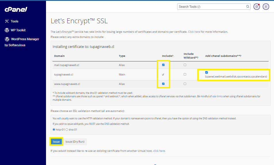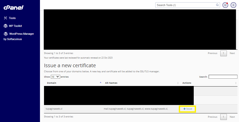 5. Al ingresar a "Let's Encrypt™ SSL" busca "Issue a new certificate" y haz clic en "+Issue".