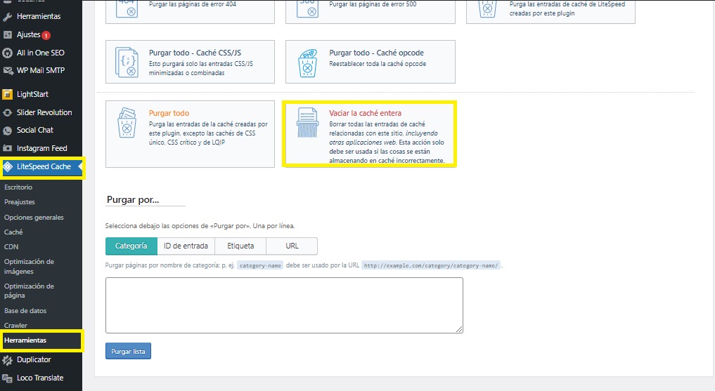 3. Luego de hacer clic en el submenú “Herramientas”, a la derecha tendrás varias opciones, haz clic en la que indica “Vaciar la cache entera”. De esta forma quedará limpia.
