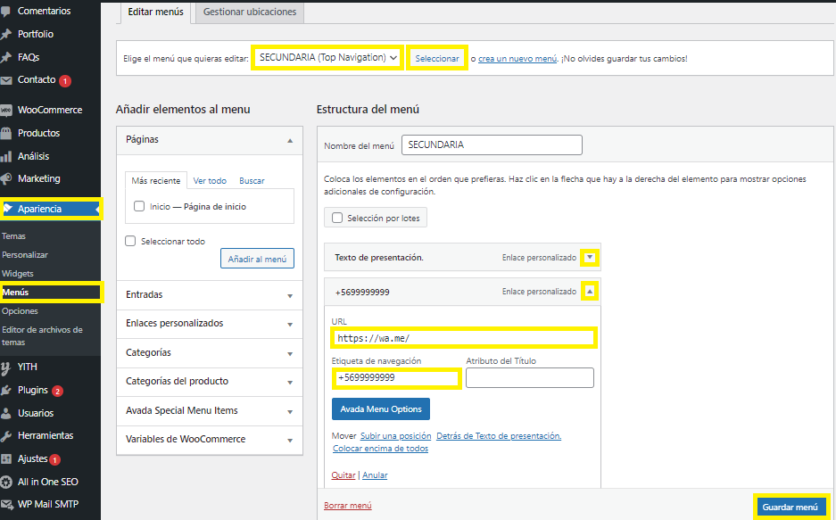 3. Encuentra la sección que indica "Elige el menú que quieras editar:" y elige "SECUNDARIA", luego haz clic en el botón “seleccionar” de esta forma podrás editar el menú superior. Allí está cada uno de los componentes del menú de contacto. Al hacer clic en triángulo que está al costado derecho de cada menú, se despliega la edición del nombre y el link del menú. Luego de editar, se debe guardar los cambios hechos en el botón "Guardar Menú".
