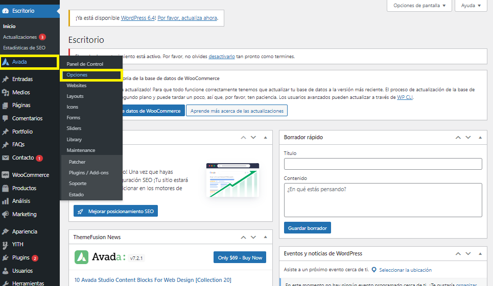 2. Busca el menú "Avada" y luego haz clic en el sub menú "Opciones".
