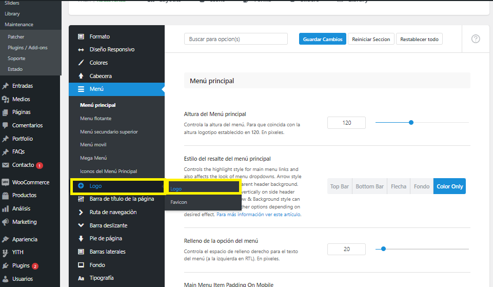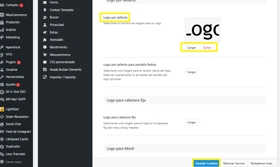 4. Dentro del menú de "Logo" debe modificar la información en 2 secciones. La primera es "Logo por defecto", y la segunda es "Logo por defecto para pantalla Retina" (esta solo aparece luego que cargue el logo por defecto).
