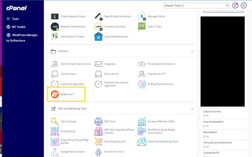 2. Dentro de Cpanel busca la opción "Archivos" y haz clic en "JetBackup 5". Luego espere a que la aplicación cargue la información de su sitio web.