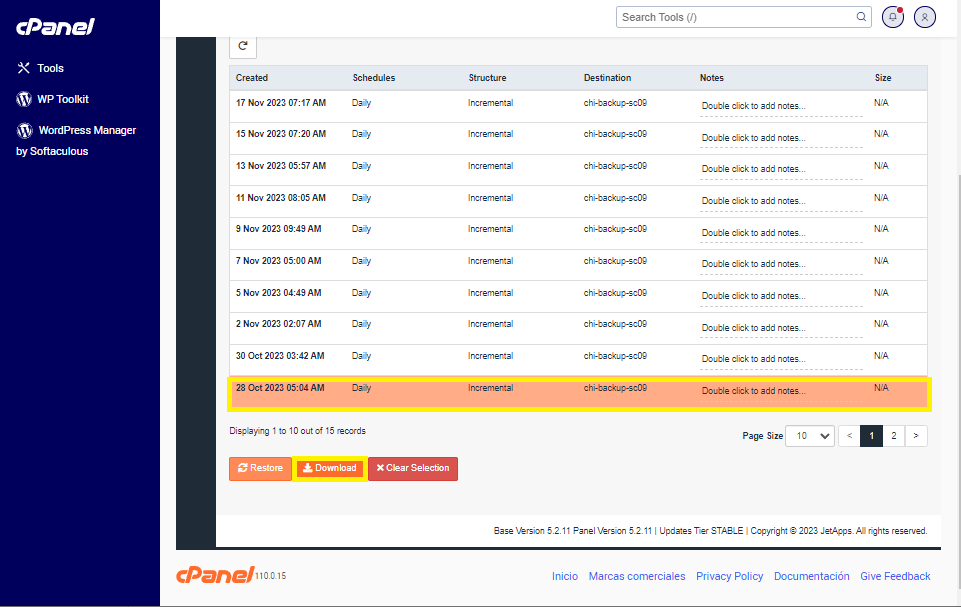 3. Dentro de "JetBackup 5" busca la opción de "Full Account Backup" y haz clic. Dentro de esta opción busca la el día de la copia de seguridad que quieres restaurar. Haz clic en "DOWNLOAD" para que la copia de seguridad se instale.