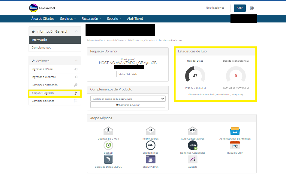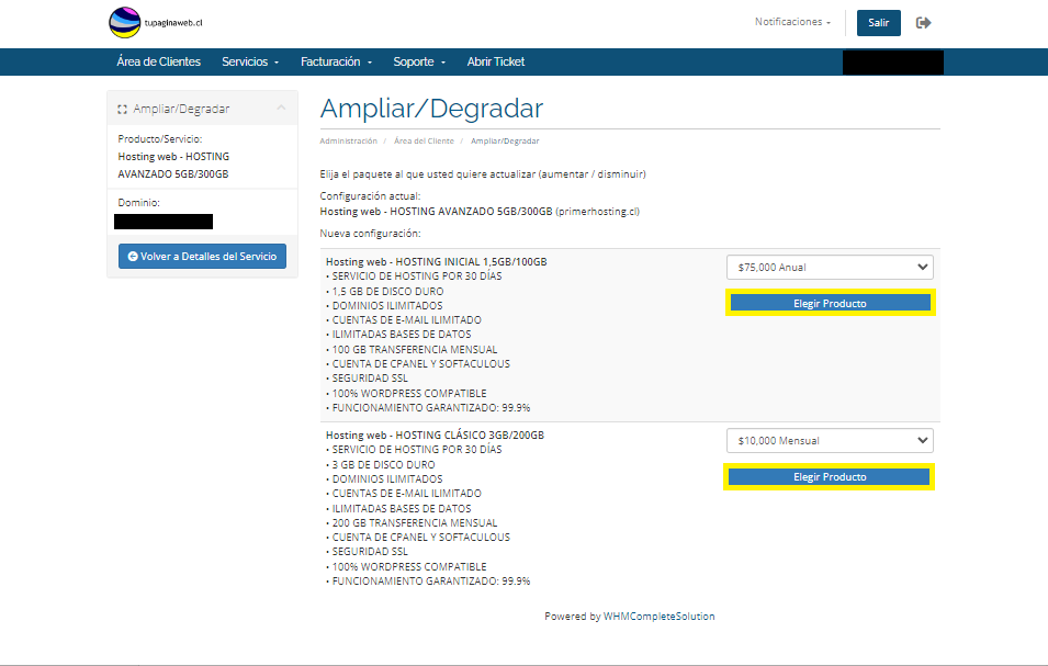 3. Dentro de los detalles de tu servicio busca la caja de "Opciones" en esta has clic en "Ampliar/Degradar".