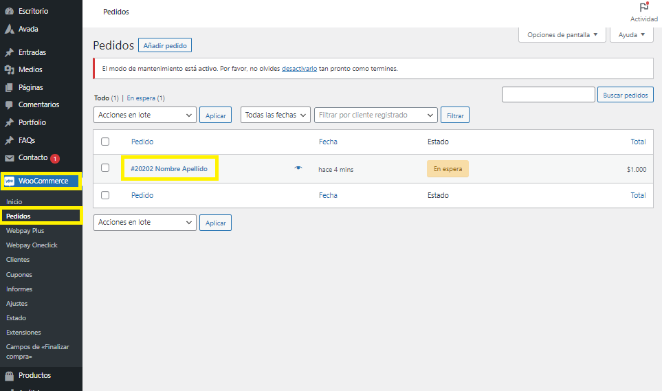 2. Dentro de tu cuenta de WordPress busca el menú “Woocommerce” y seleccionar el submenú de este “Pedidos”. Dentro de la opción de "Pedidos" podrá ver cada uno de los pedidos de su tienda, para obtener el detalle de la compra debe hacer clic en el número de pedido o en el nombre del cliente.
