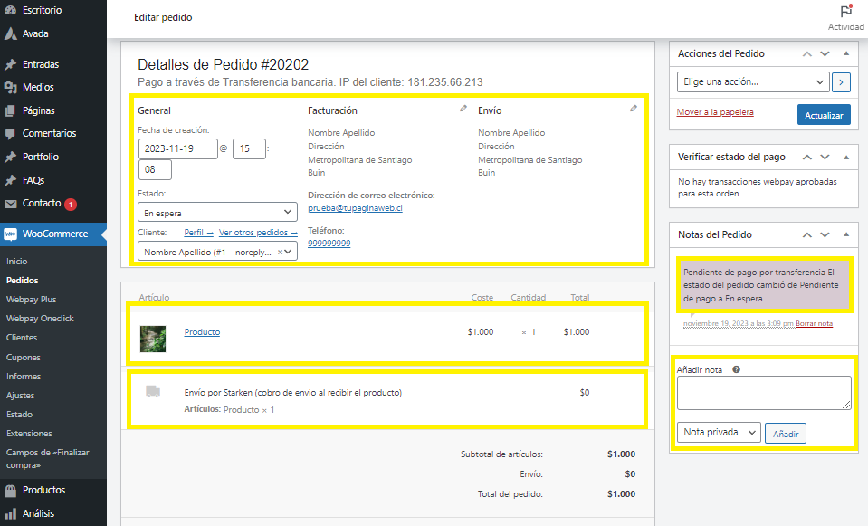 En el área "General" está la siguiente información del pedido: Fecha, hora, estado, nombre, información de contacto, dirección de envío.