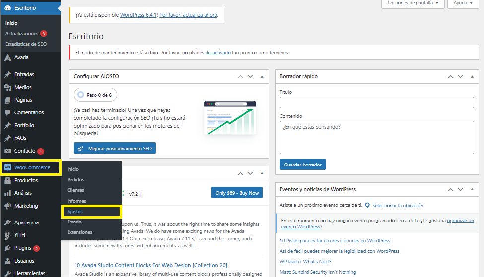 2. Busca el menú "Woocommerce" y haz clic en submenú "Ajustes".