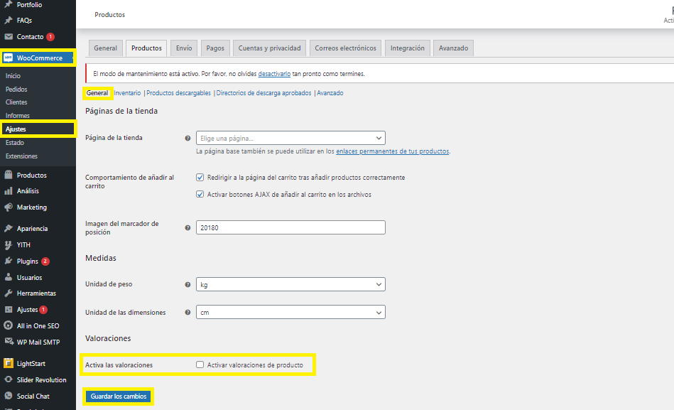 3. Dentro del submenú de "Ajustes" haz clic en la opción "Productos" y busca la opción de "Activar valoraciones de producto". Debes activar la casilla y luego hacer clic en "Guardar los cambios".