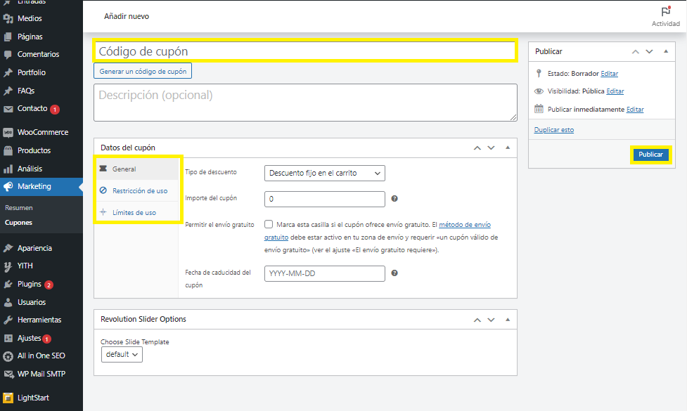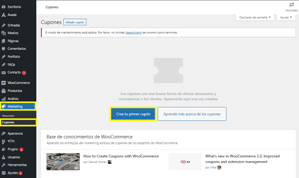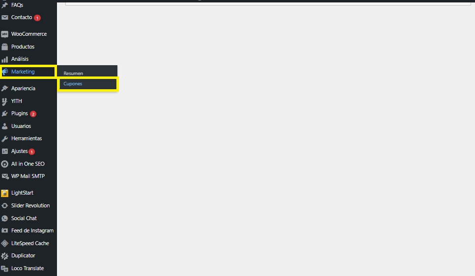 2. Busca el menú "Marketing", luego el submenú "Cupones".