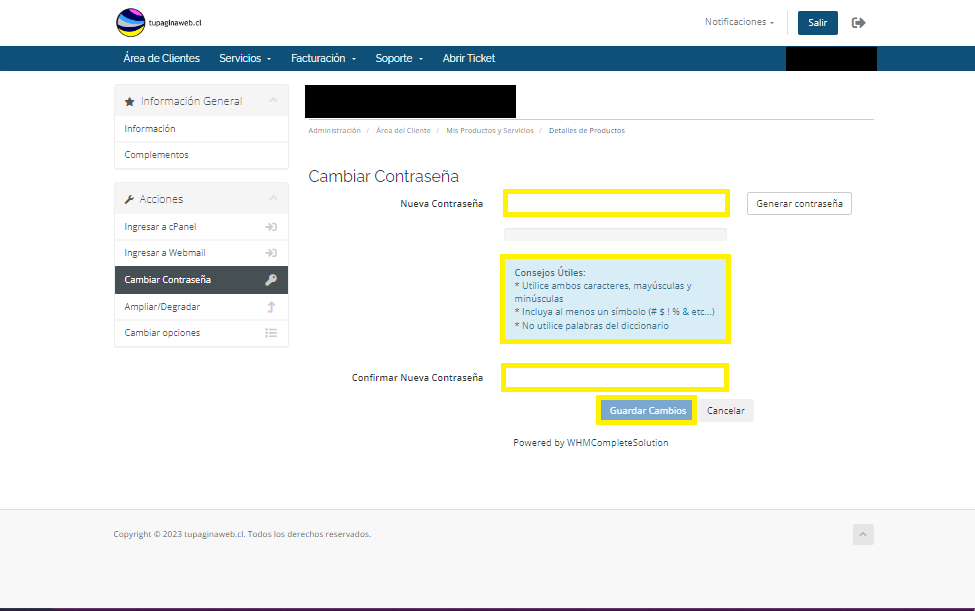 3. Crea tu contraseña nueva según las instrucciones y haz clic en "Guardar Cambios". De esta forma se cambia tu contraseña de Cpanel.