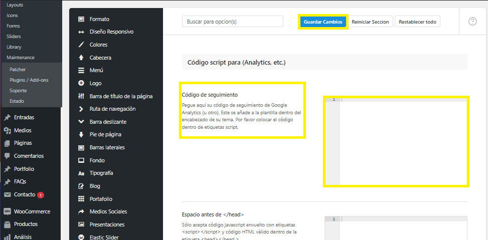 3. Dentro del menú opciones está disponible a la derecha el menú de configuración. En este debe buscar la opción "Avanzado" y hacer clic en el submenú "Códigos script para (Analytics, etc)".