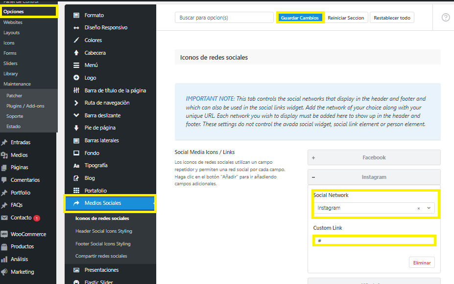 3. Dentro de opciones, busca el menú "Medios sociales". En esta opción debes seleccionar el tipo de red social y el enlace al cual deriva luego de hacer clic. Para finalizar debes guardar la configuración en el botón "Guardar Cambios".