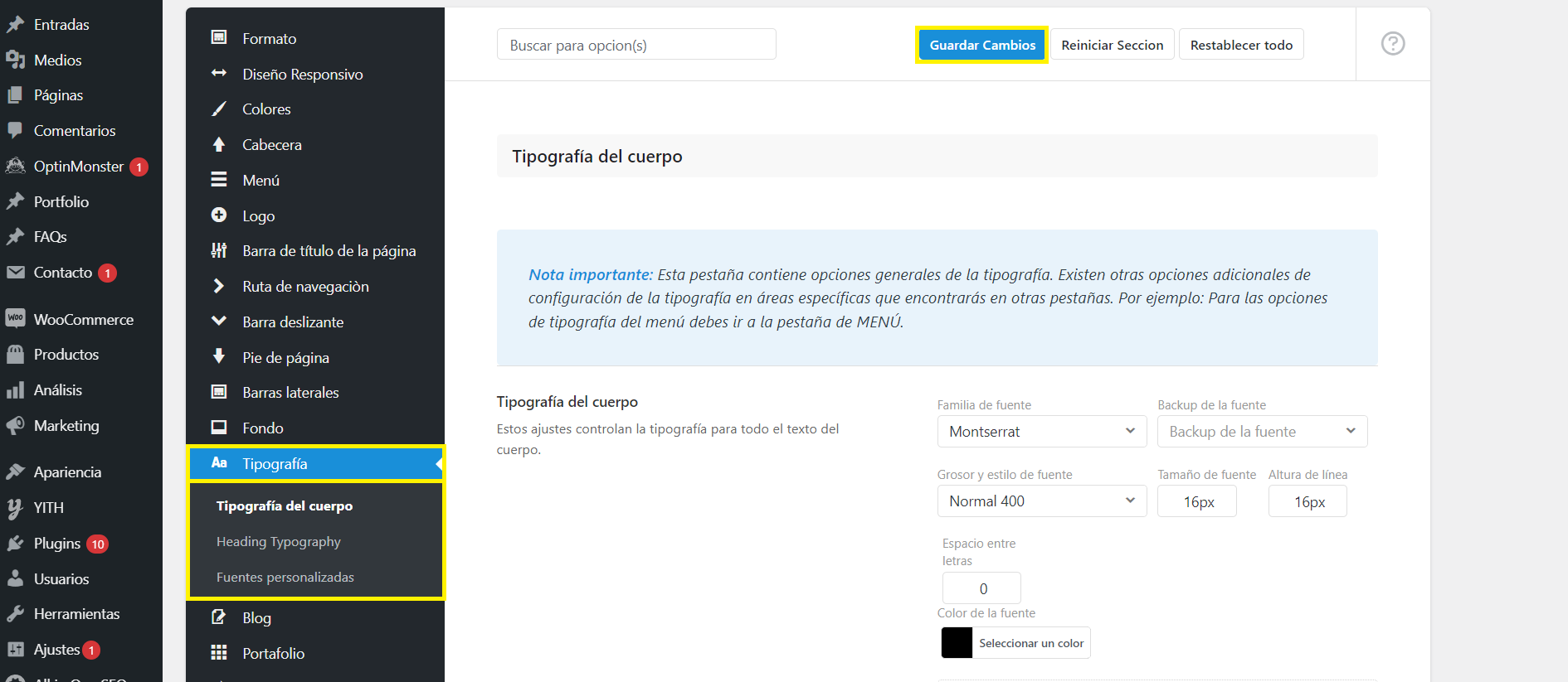 3. Dentro de opciones buscar el menú que dice "Tipografía", allí encontrará 3 submenús en los cuales se utilizan los dos primeros: Tipografía de cuerpo (menos importante), Heading Typography (más utilizado).
