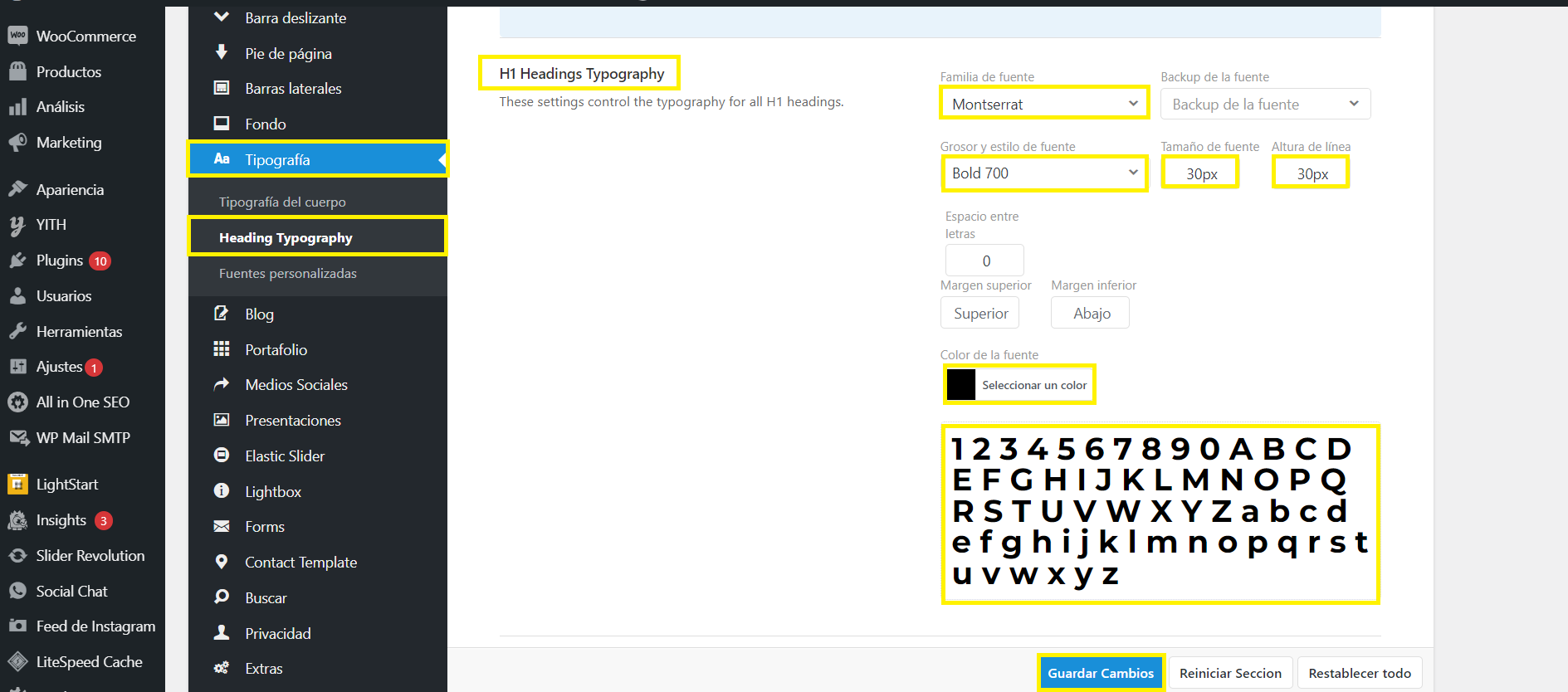 La mayor parte de los textos del sitio web cumplen las reglas que están en Heading Typography, aquí puedes ver las características de cada una de las letras que están en tu sitio web.