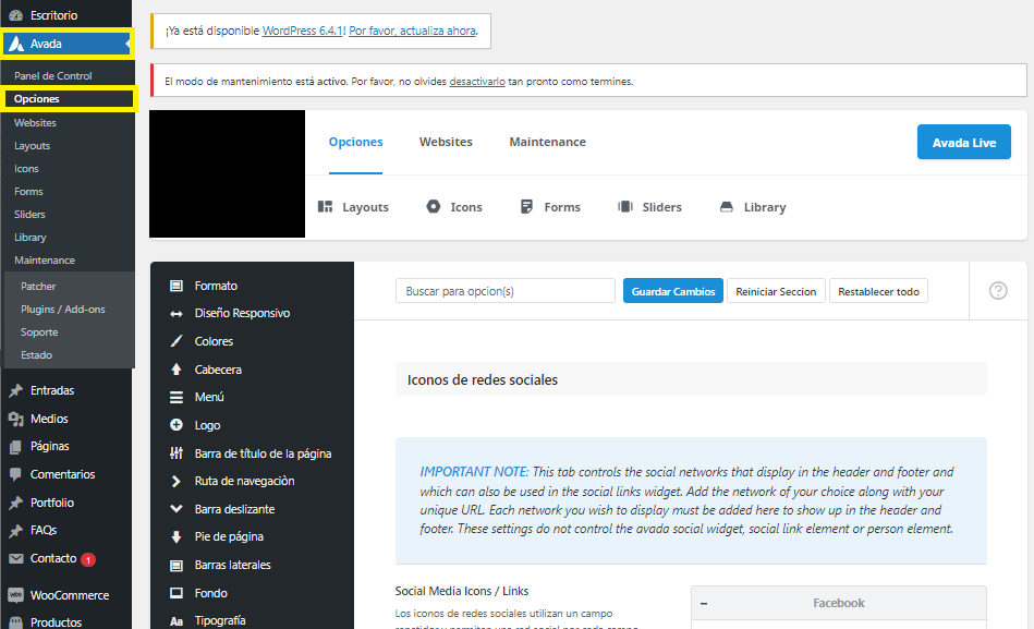 2. Busca el menú "Avada" y luego haz clic en el submenú "Opciones".