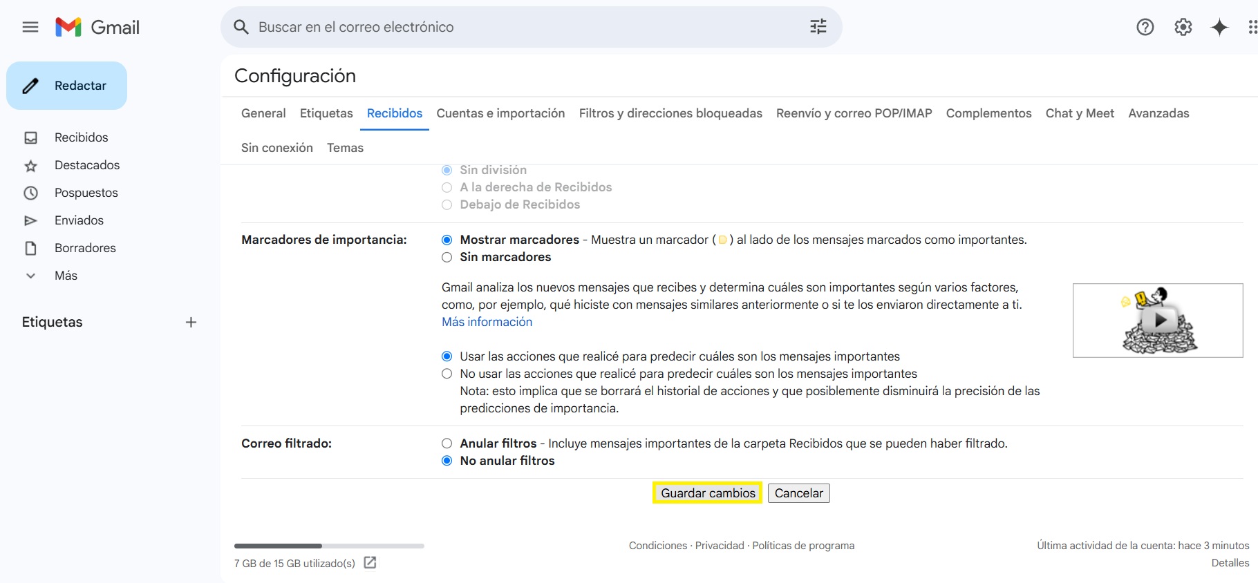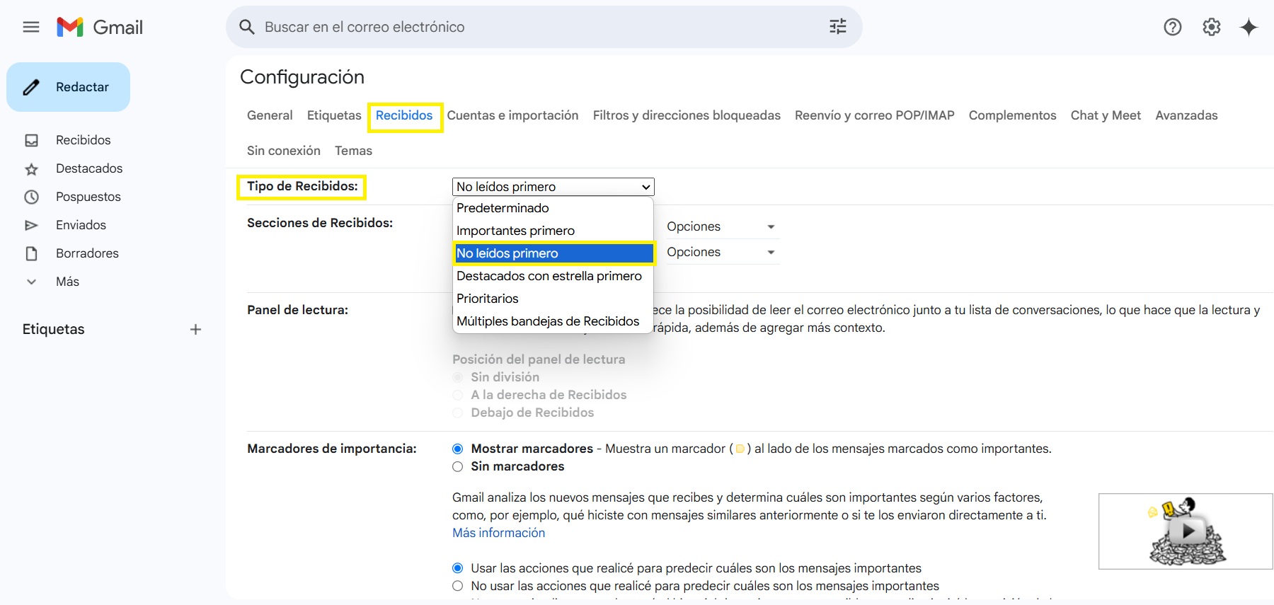 Después de acceder a la configuración, ingresa en la sección de "Recibidos" busca la opción "Tipo de recibidos" la opción "No leídos primero" es la recomendada para que todos los correos estén en mismo listado, además de los no leídos primero. Para que esto se haga afectivo debe hacer clic en el botón "Guardar cambios".