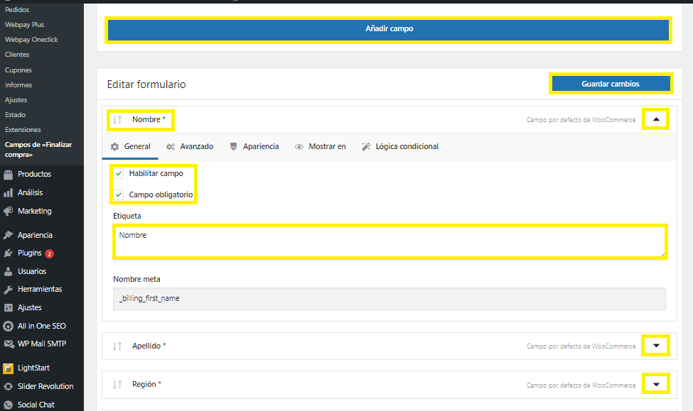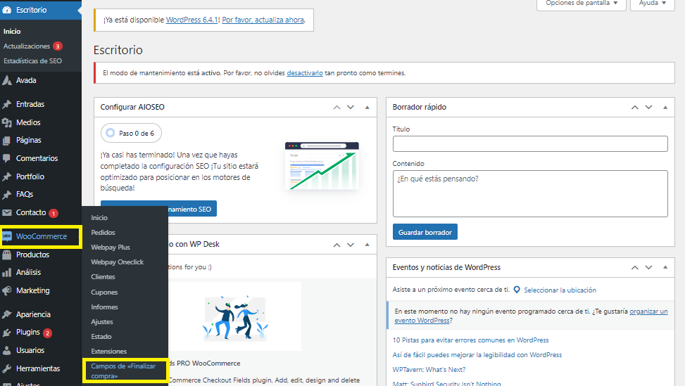 2. Dentro de tu cuenta de WordPress busca el menú “Woocommerce” y seleccionar el submenú "Campos de «finalizar compra»