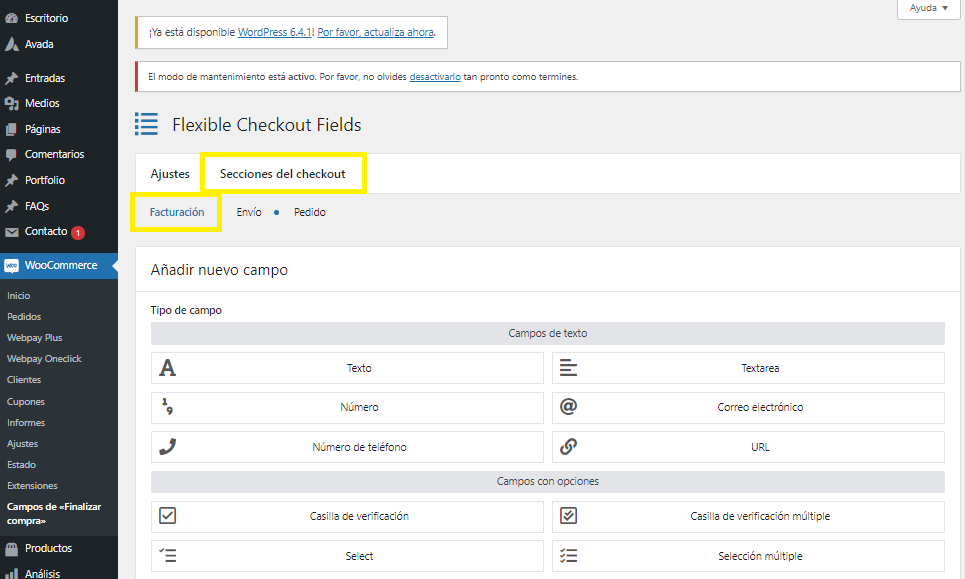 3. Dentro de estas opciones asegurarte que esté en "Secciones del checkout" y "Facturación"